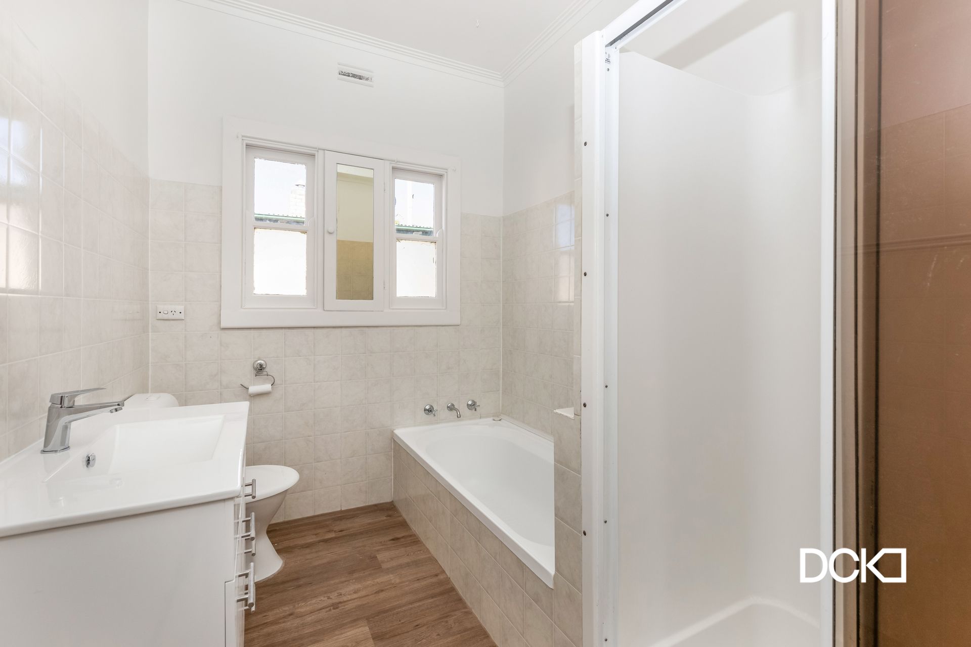 Bathroom has shower, bath and new vanity and toilet.