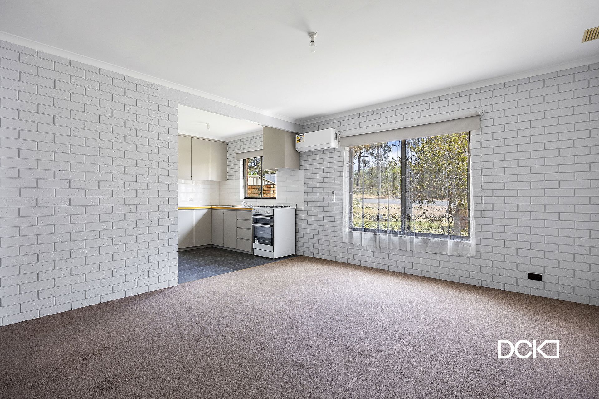 The open living area offers a split system and space for a dining table and leads into the kitchen which contains several cupboards and gas cooking facilities.