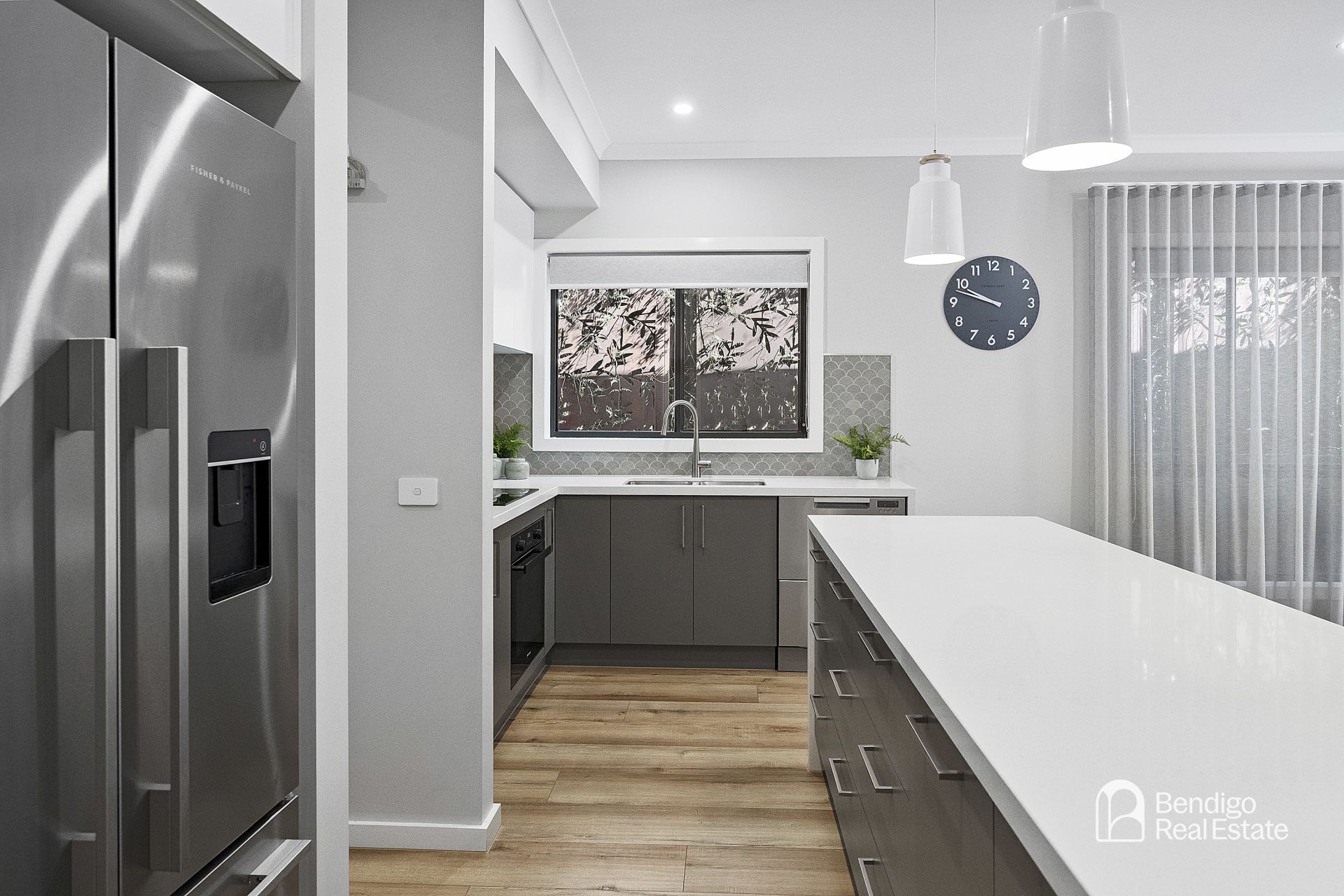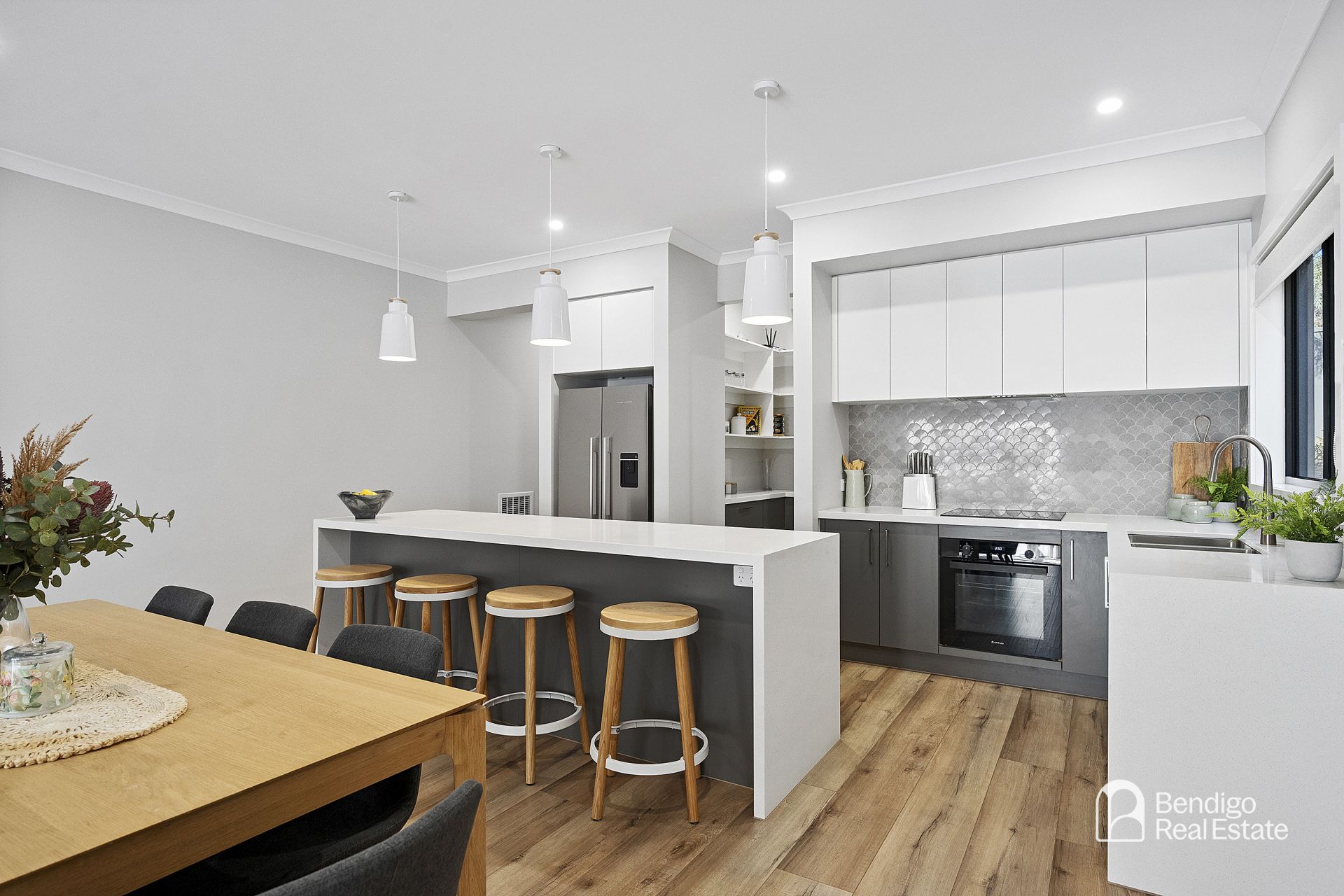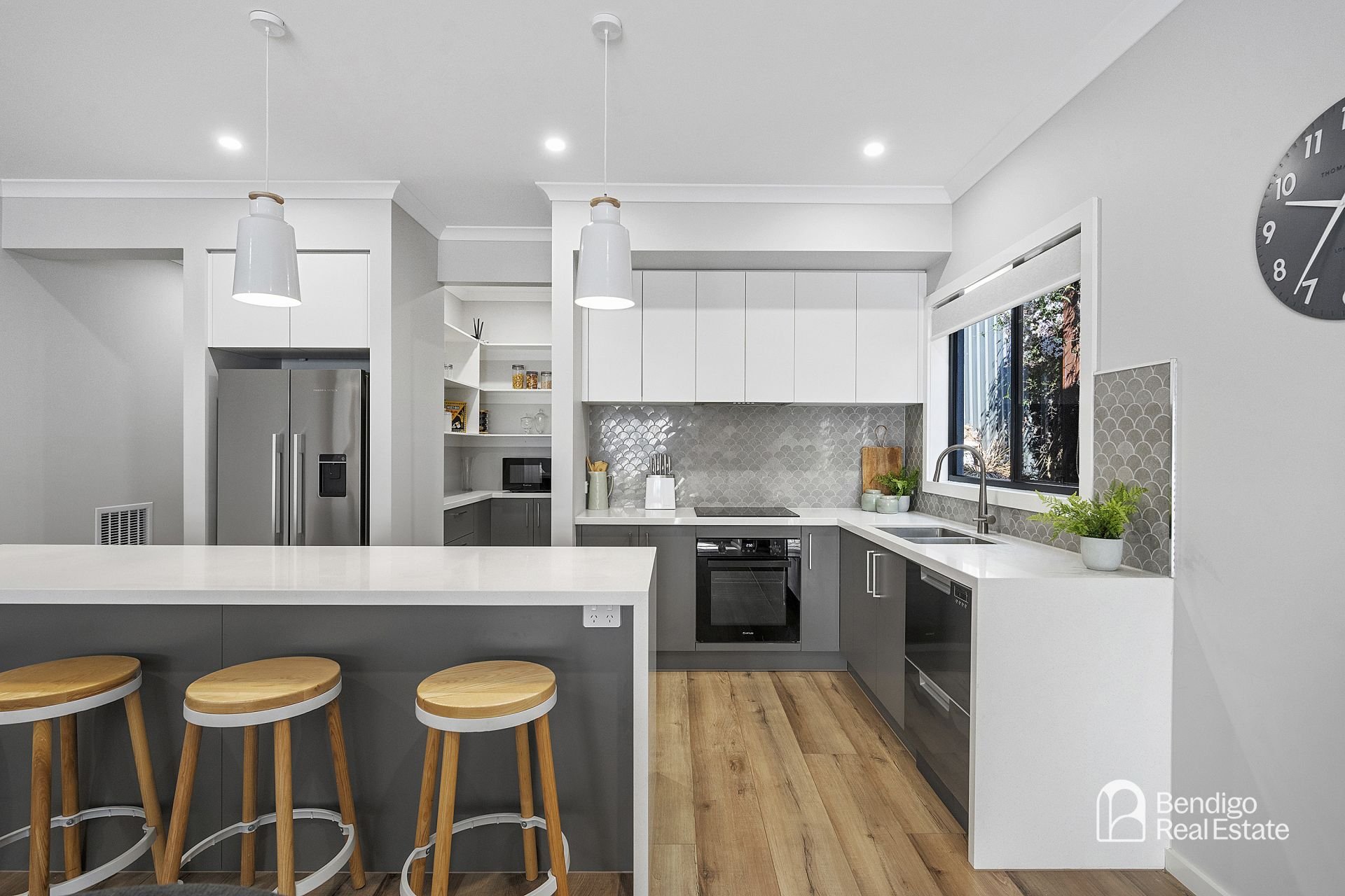 • Kitchen has black under-bench oven, wide pot drawers and stone waterfall island bench.