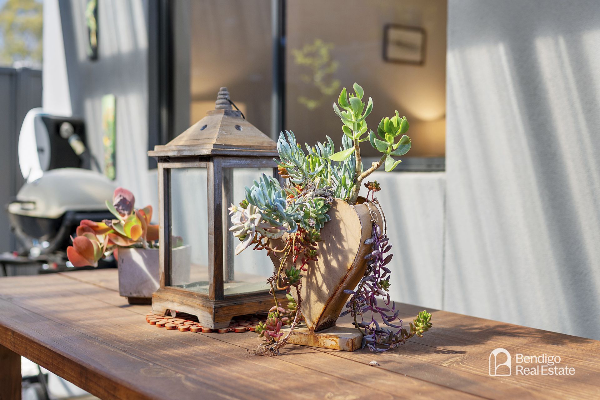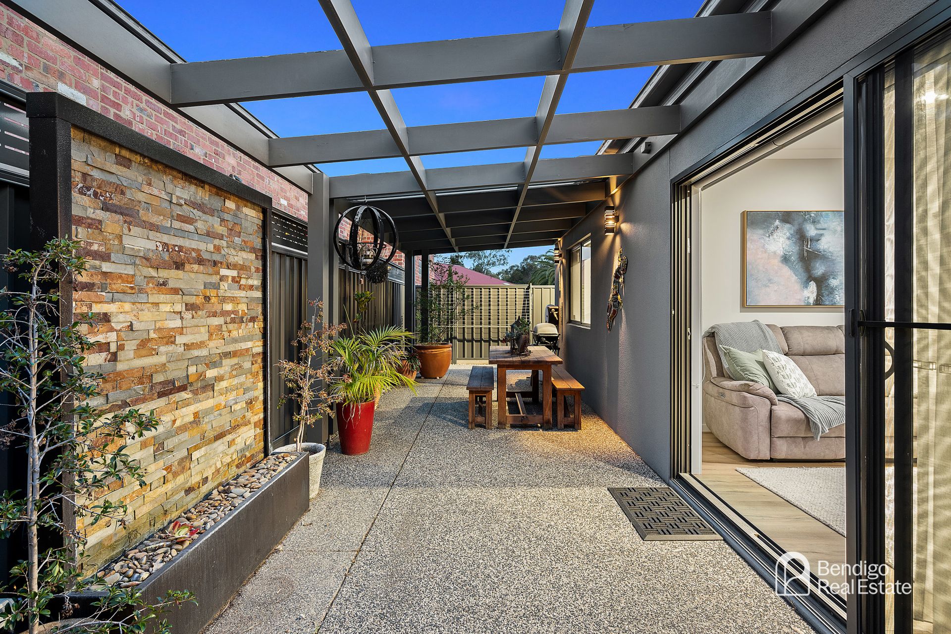 • Private rear patio with aggregate concrete base and stone feature.