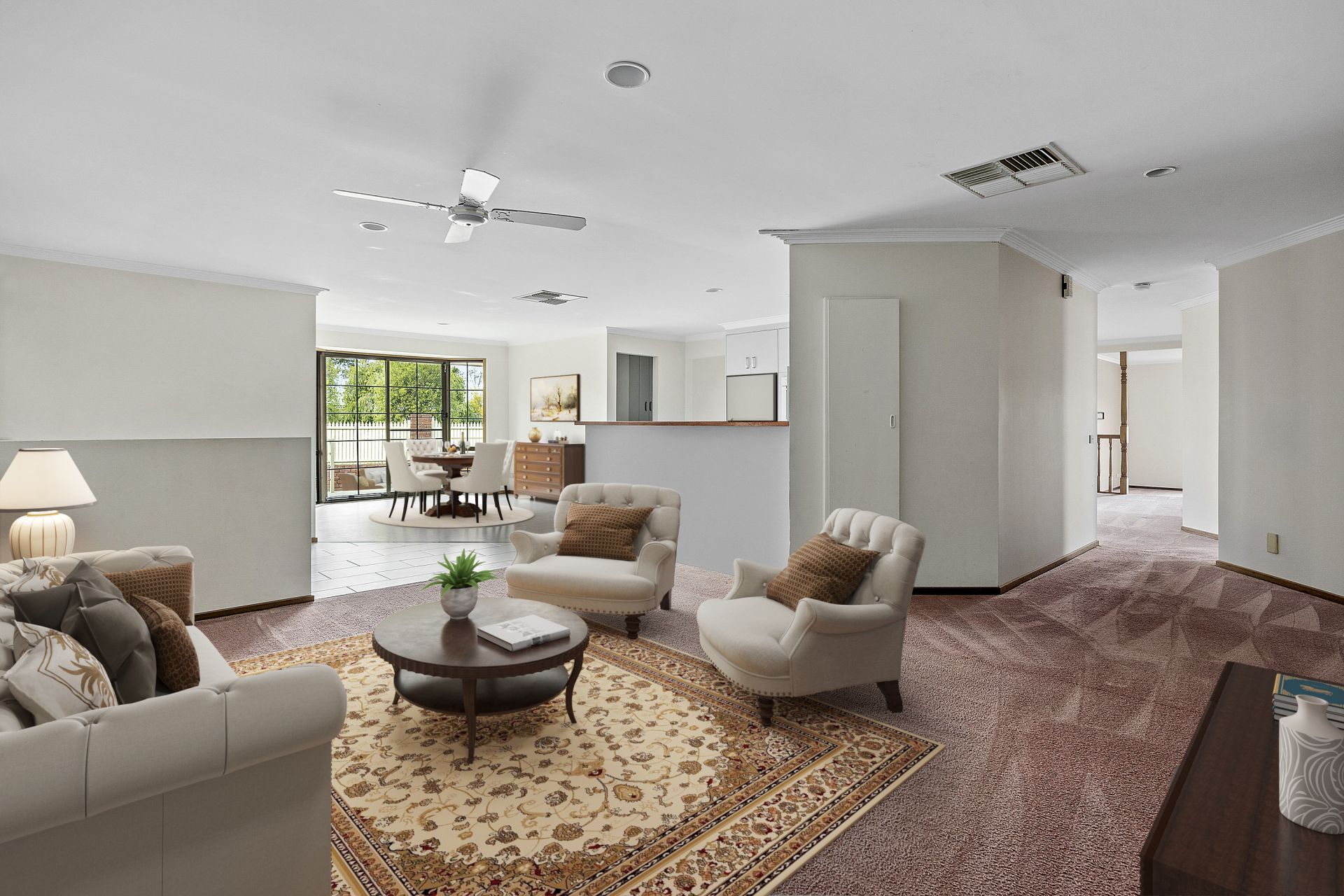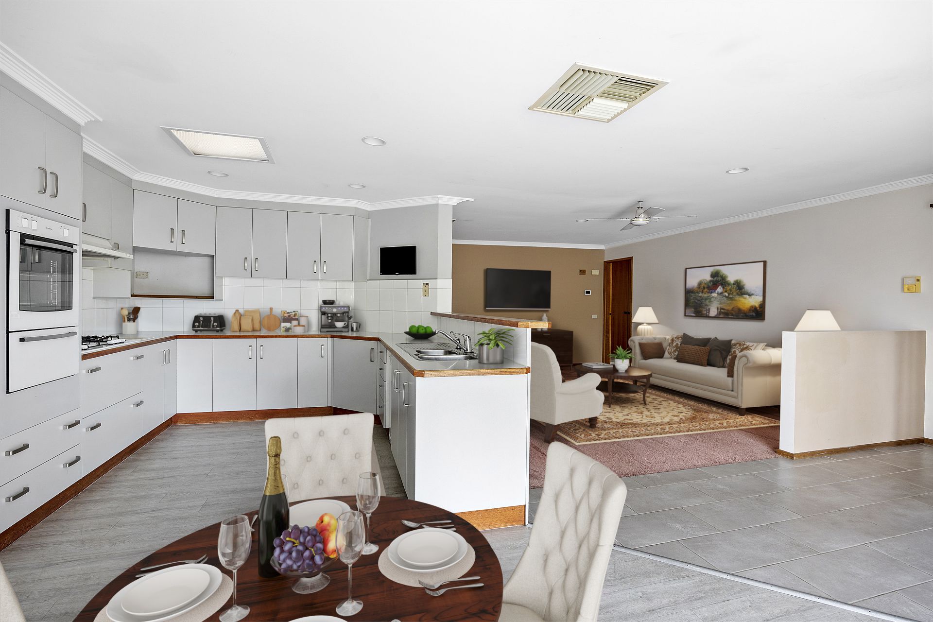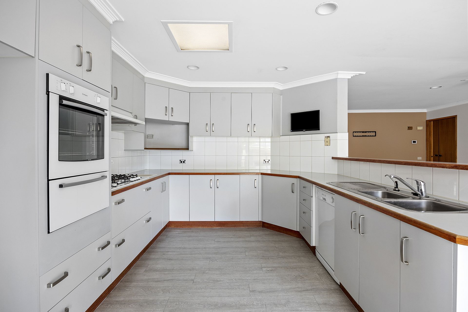 The loungeroom has a ceiling fan, and a big bay window. The second living area wraps around a central kitchen that’s fully equipped for the home cook. The U-shaped kitchen has a walk-in pantry, wall oven, gas cooktop, dishwasher and generous bench space and cabinets.
