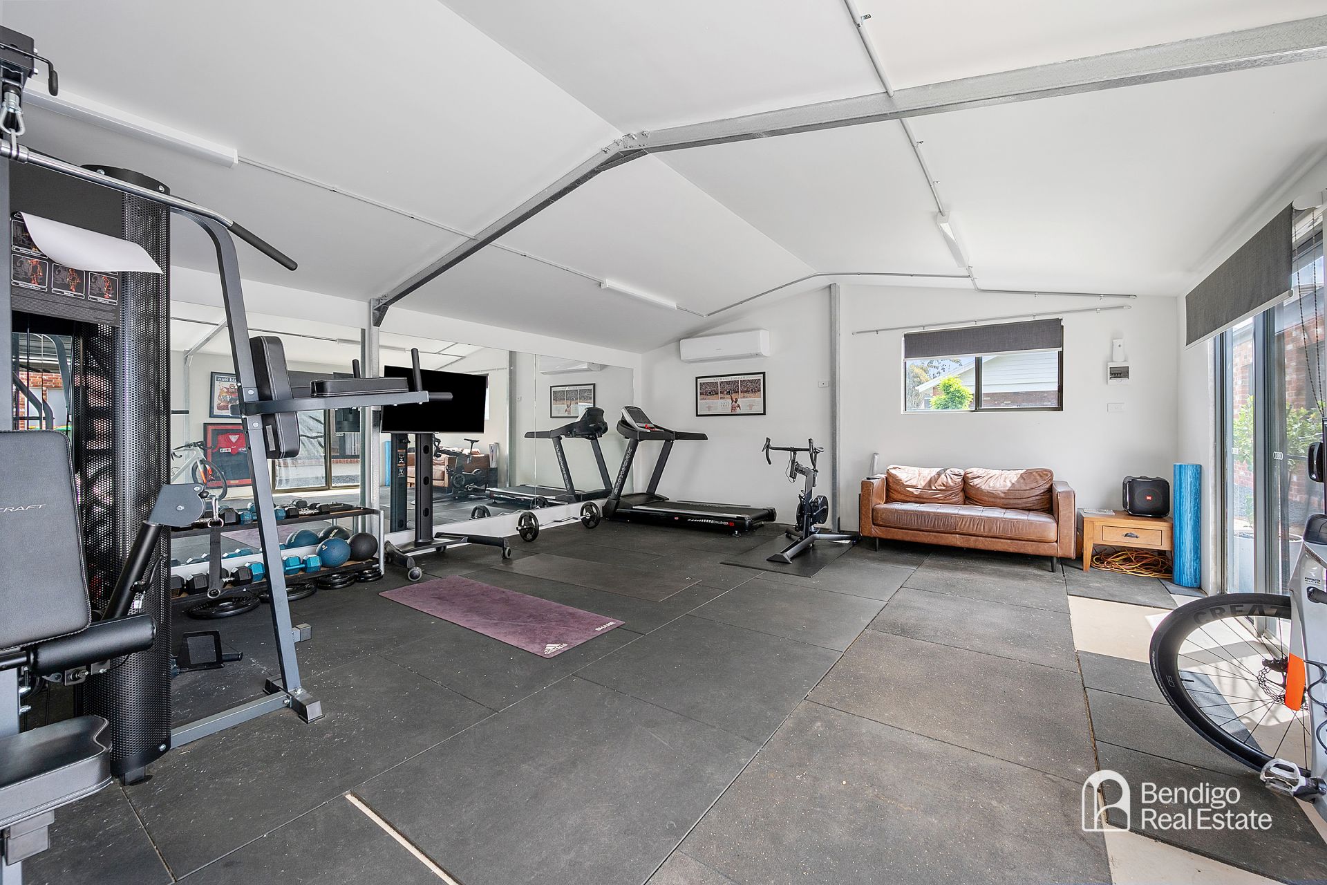 • Double garage, side vehicle access to second garage, fully lined and currently established as a home gym, with split system heating and cooling.
