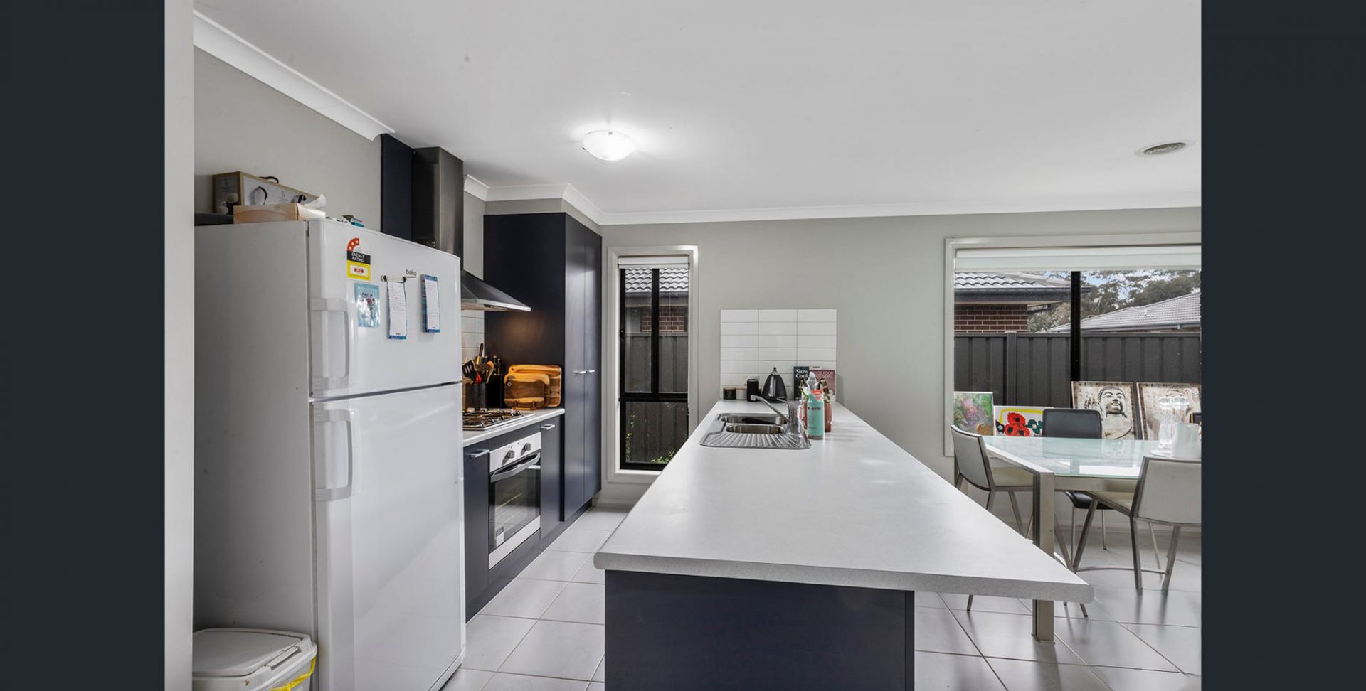 This four-bedroom home offers a practical layout with an open-plan kitchen, dining and living zone positioned centrally within the property. The kitchen includes a two-door pantry, gas cooktop, electric oven, dishwasher and storage cabinetry. A separate smaller living area or study is located at the front of the home, providing an additional flexible space.