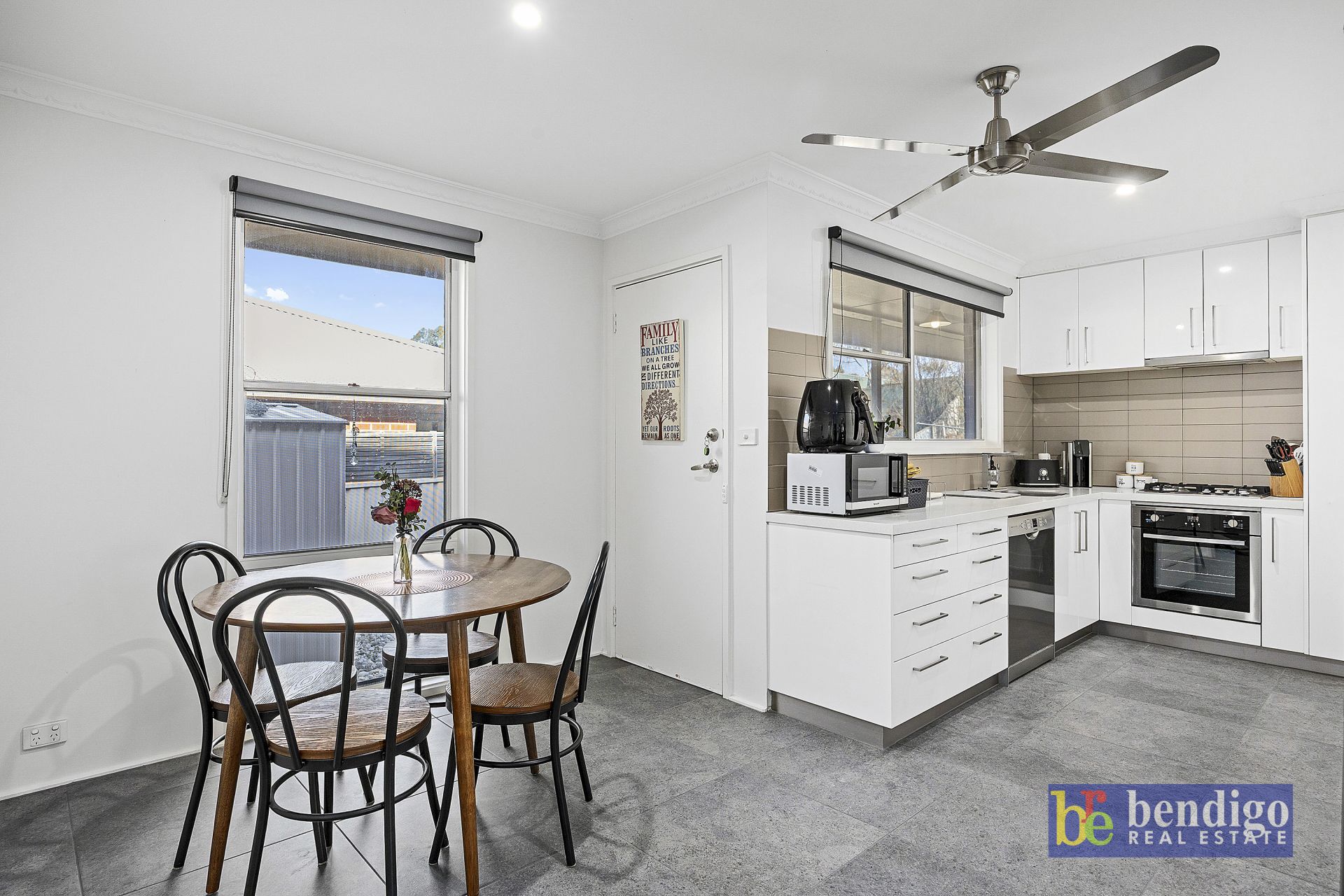 The as-new kitchen is open to a dining space. The classic white kitchen is looking fresh and features an under-bench oven, gas cooktop, dishwasher and subway tiles.