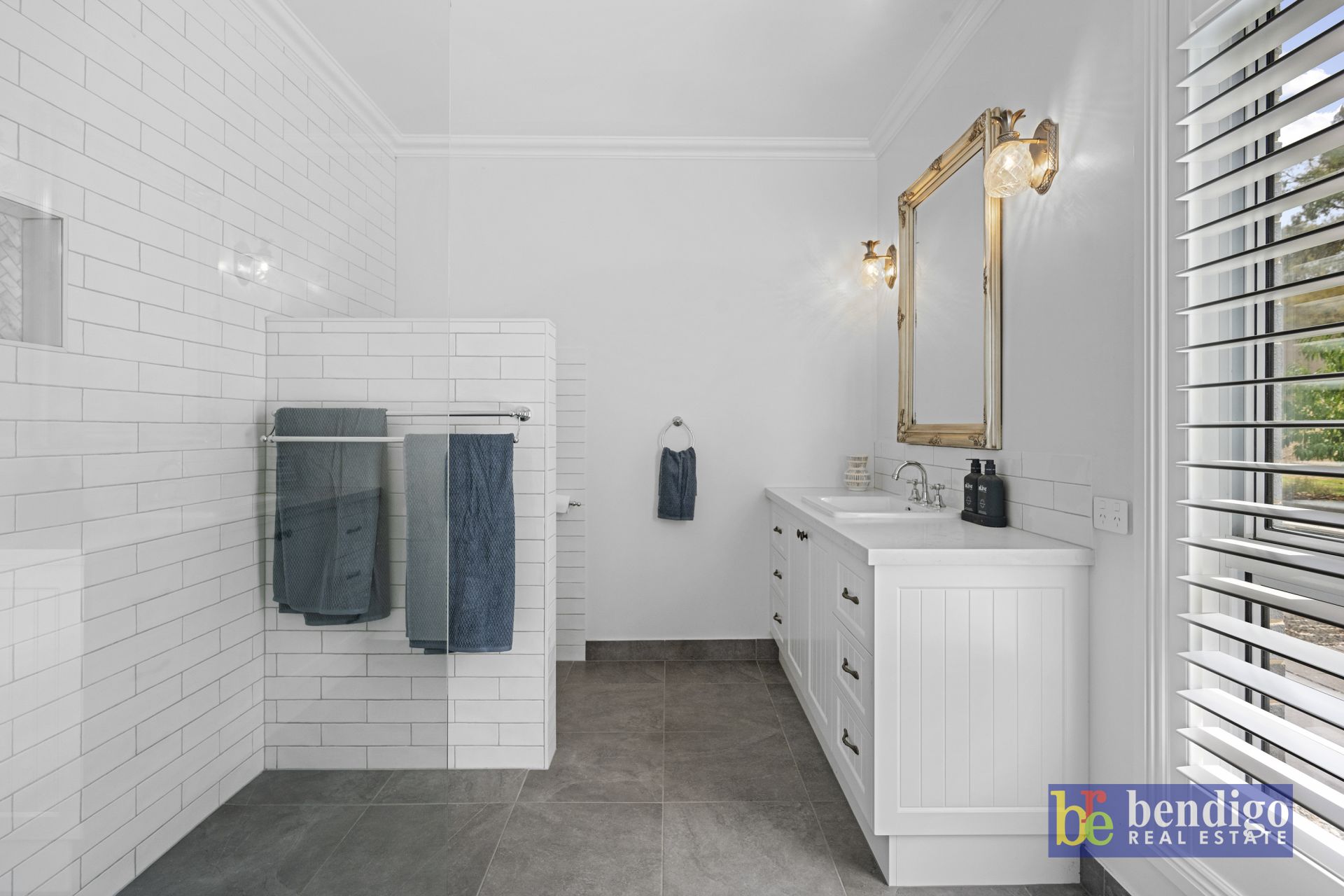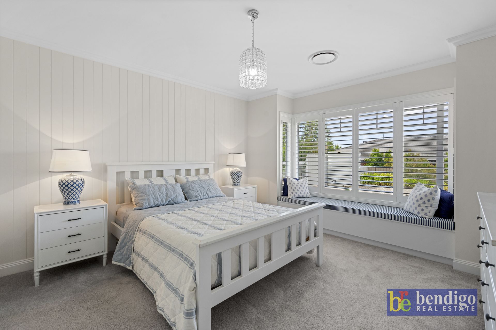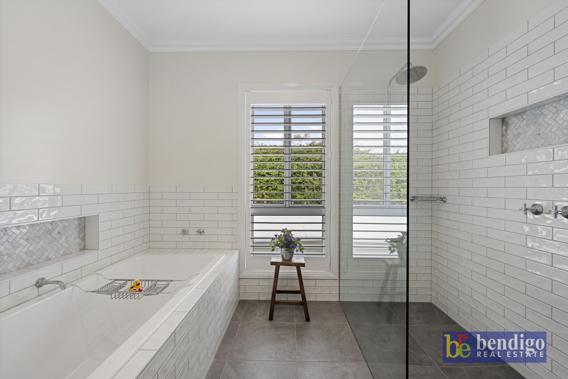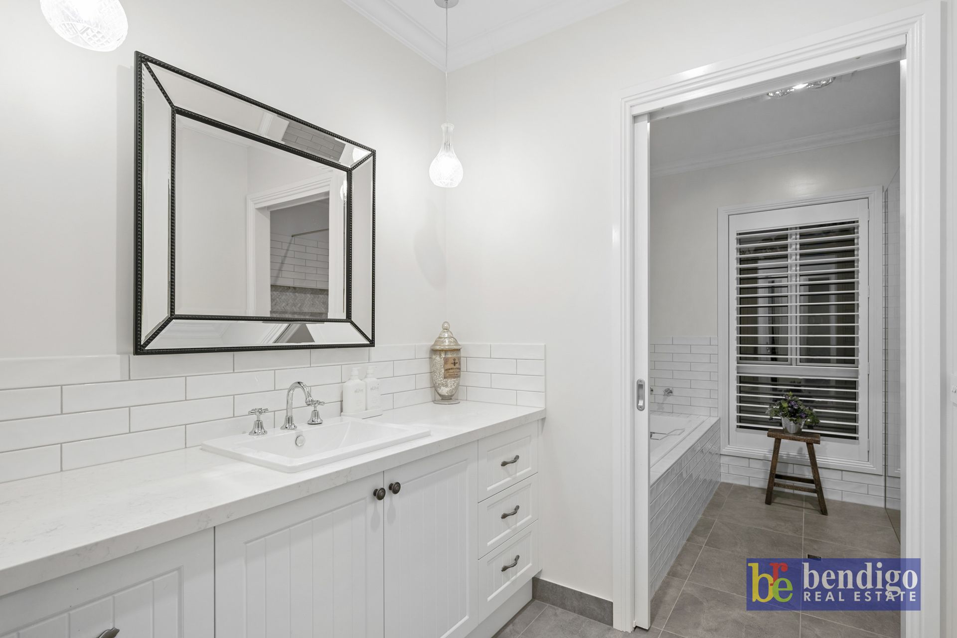 The first of four bedrooms takes full advantage of the box window. There is a huge walk-in-robe and a gorgeous ensuite with a wide frameless shower, bidet toilet behind a privacy wall, floor-to-ceiling subway tiles and a classic vanity with shaker doors.