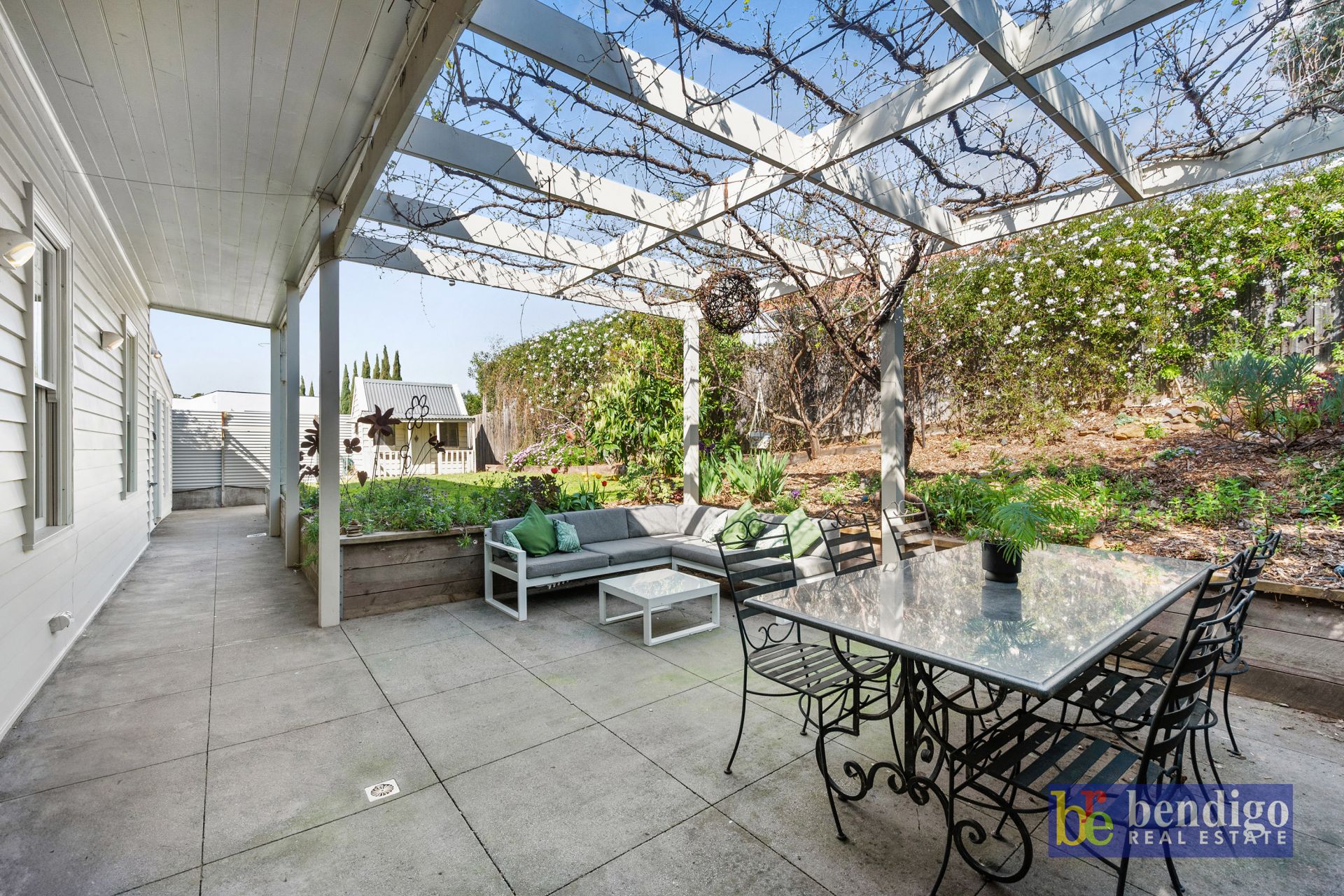 Throughout the property, you’ll find established fruit trees that add to the charm of the outdoor space, while the French doors lead out to a pergola area, draped with vines that provide both summer shade and winter sunlight. The inviting return veranda, complete with a cozy daybed, offers the perfect spot to relax and unwind.