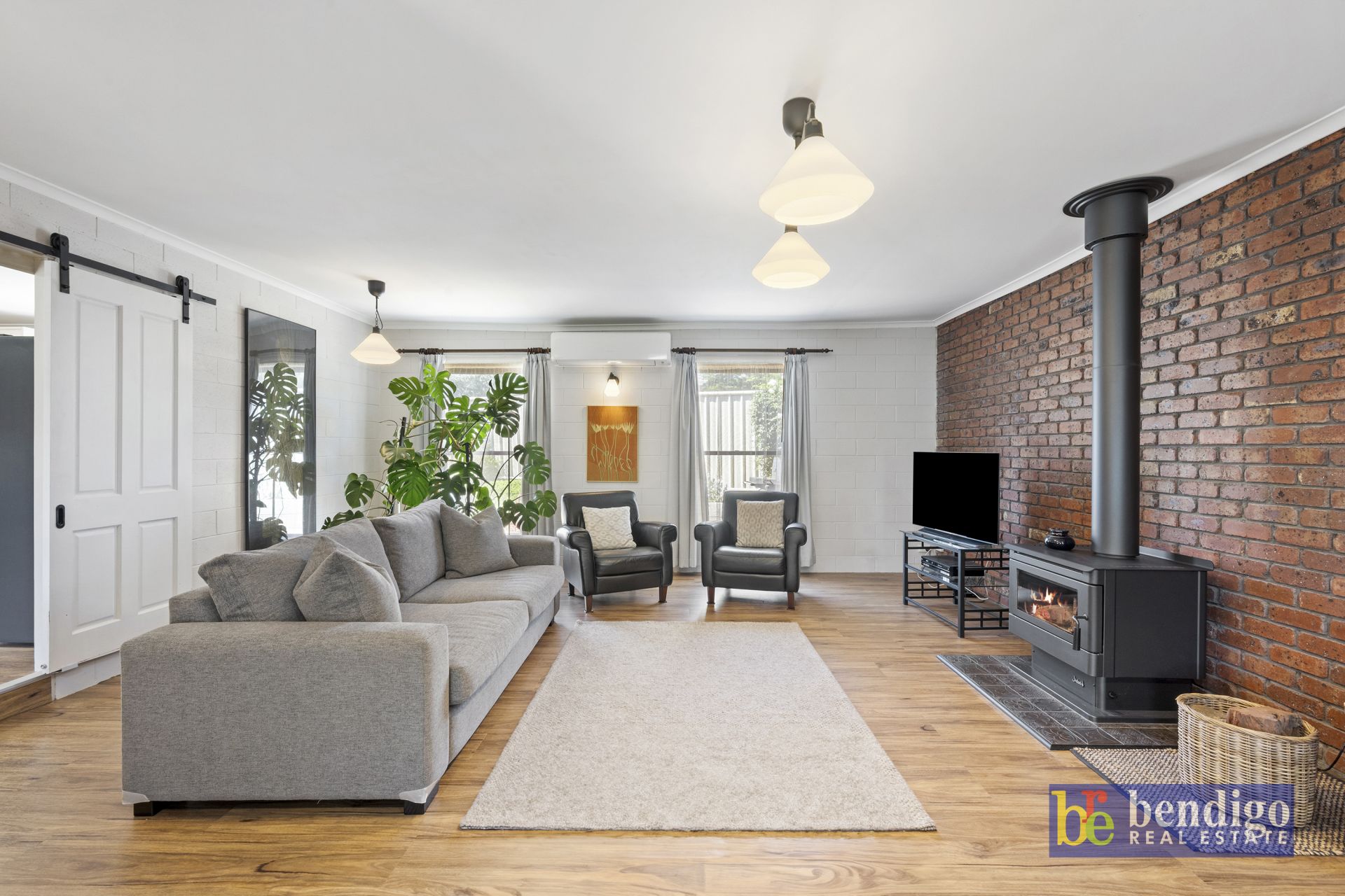 The spacious living room, complete with a beautiful exposed brick feature wall, has a cozy woodfire heater as a centrepiece. All year-round comfort and efficiency in the home is ensured by the double brick building structure, wide veranda and large capacity solar panelling on the north facing roof. The living areas are heated and cooled by Split System air conditioning units.