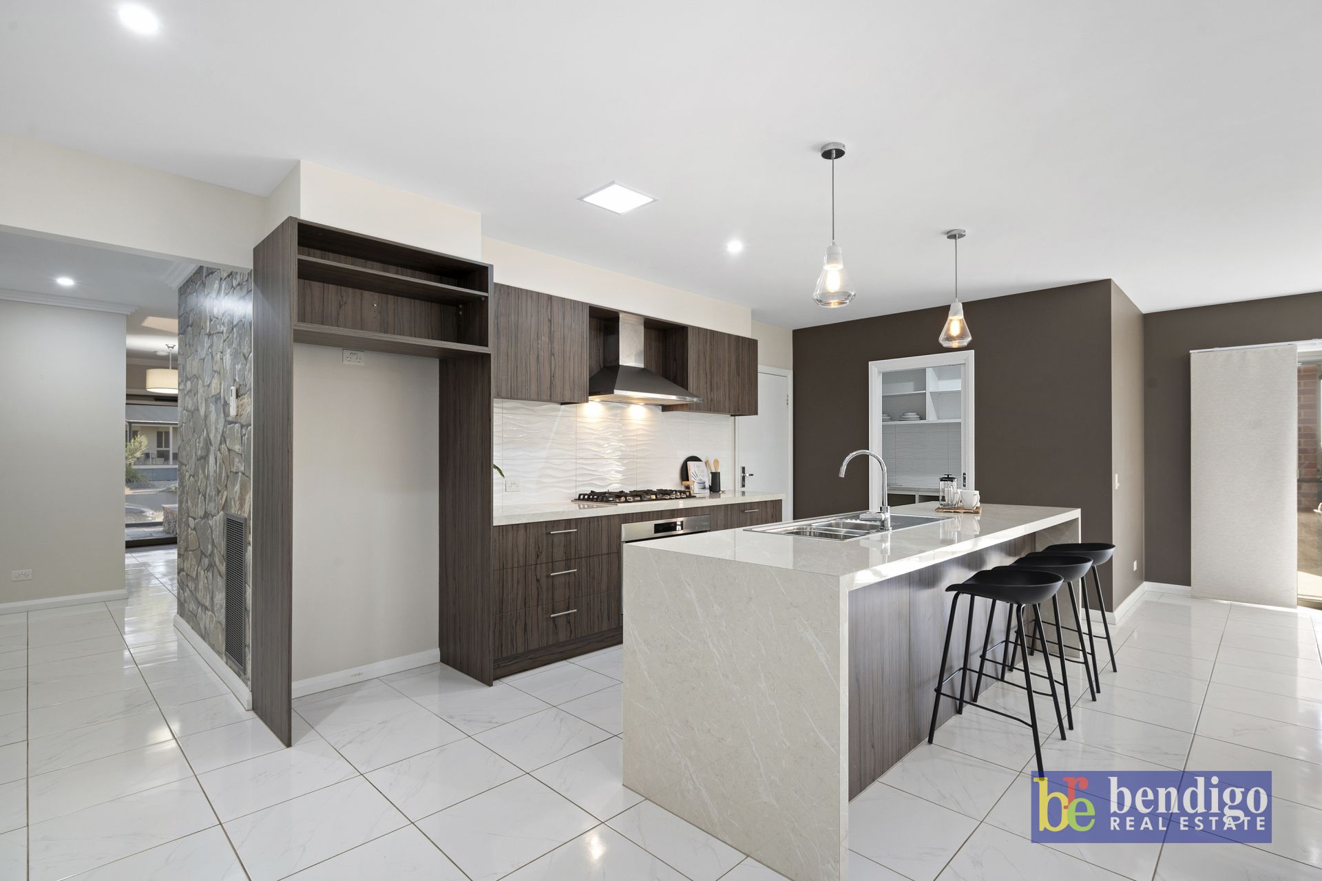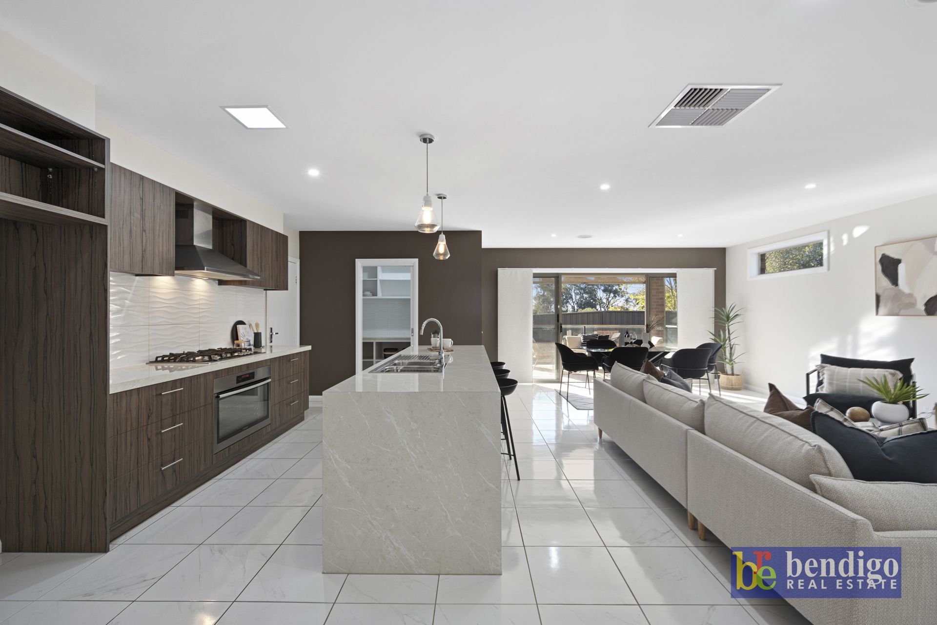 The kitchen is the true heart of the home, offering a walk-in pantry, 900mm cooktop and oven, pendant lighting above a six-seater island bench with a built-in dishwasher, and seamless access to a full-sized laundry that also connects to the oversized double garage.