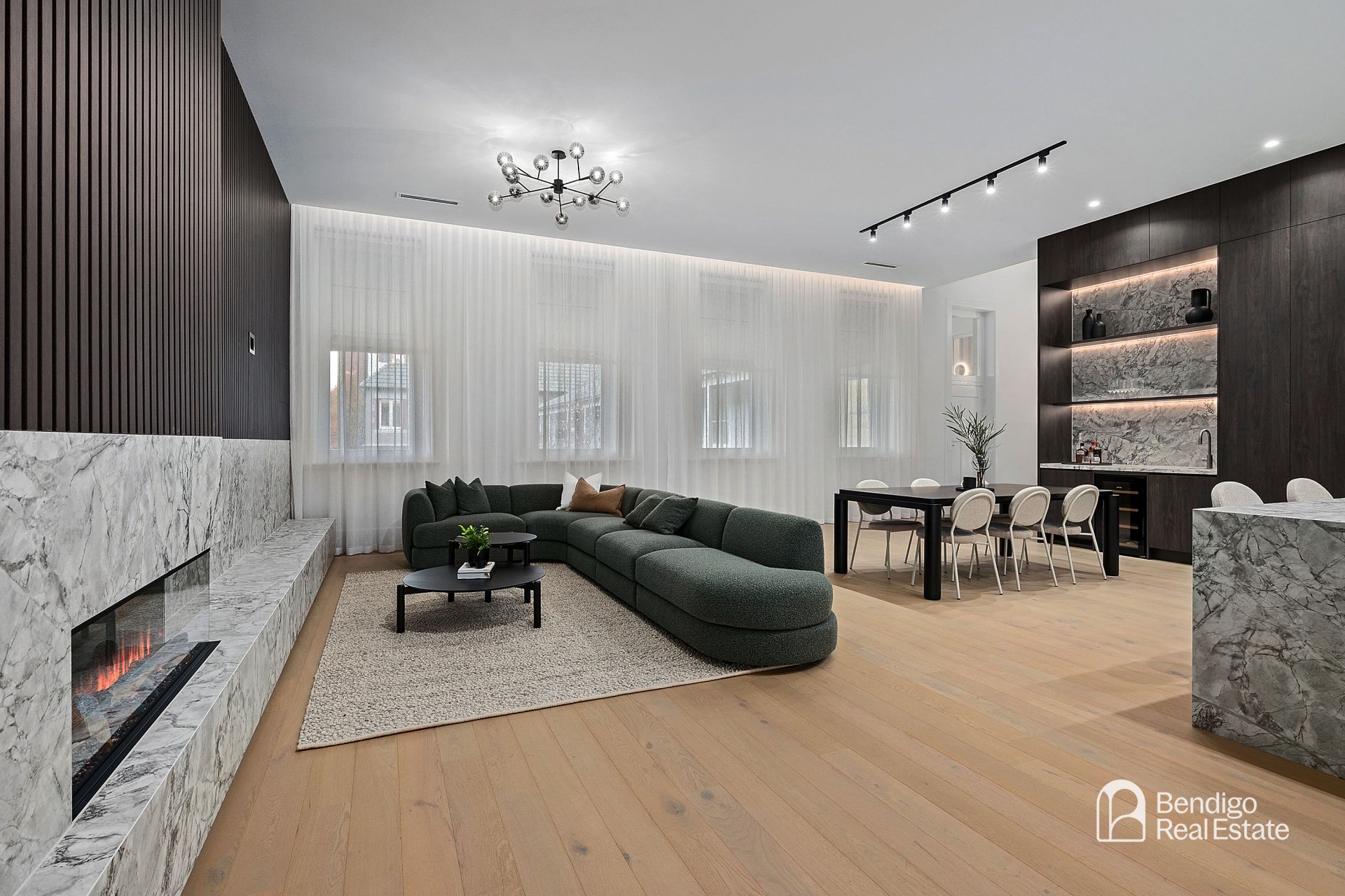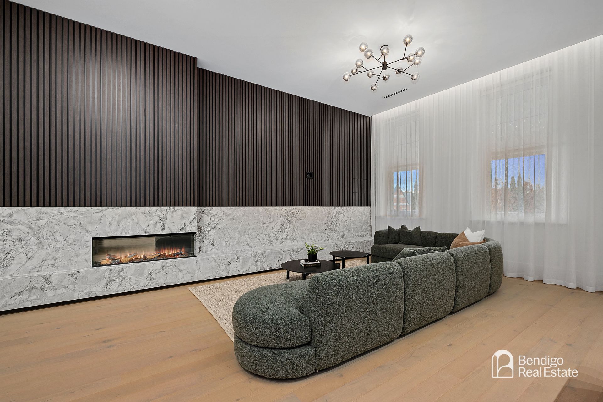 The spacious living room, with built-in study nook, has a high ceiling, engineered oak underfoot and floor-to-ceiling sheers across four picture windows. Timber-lined walls and a built-in electric fireplace bring warmth and texture to the space.