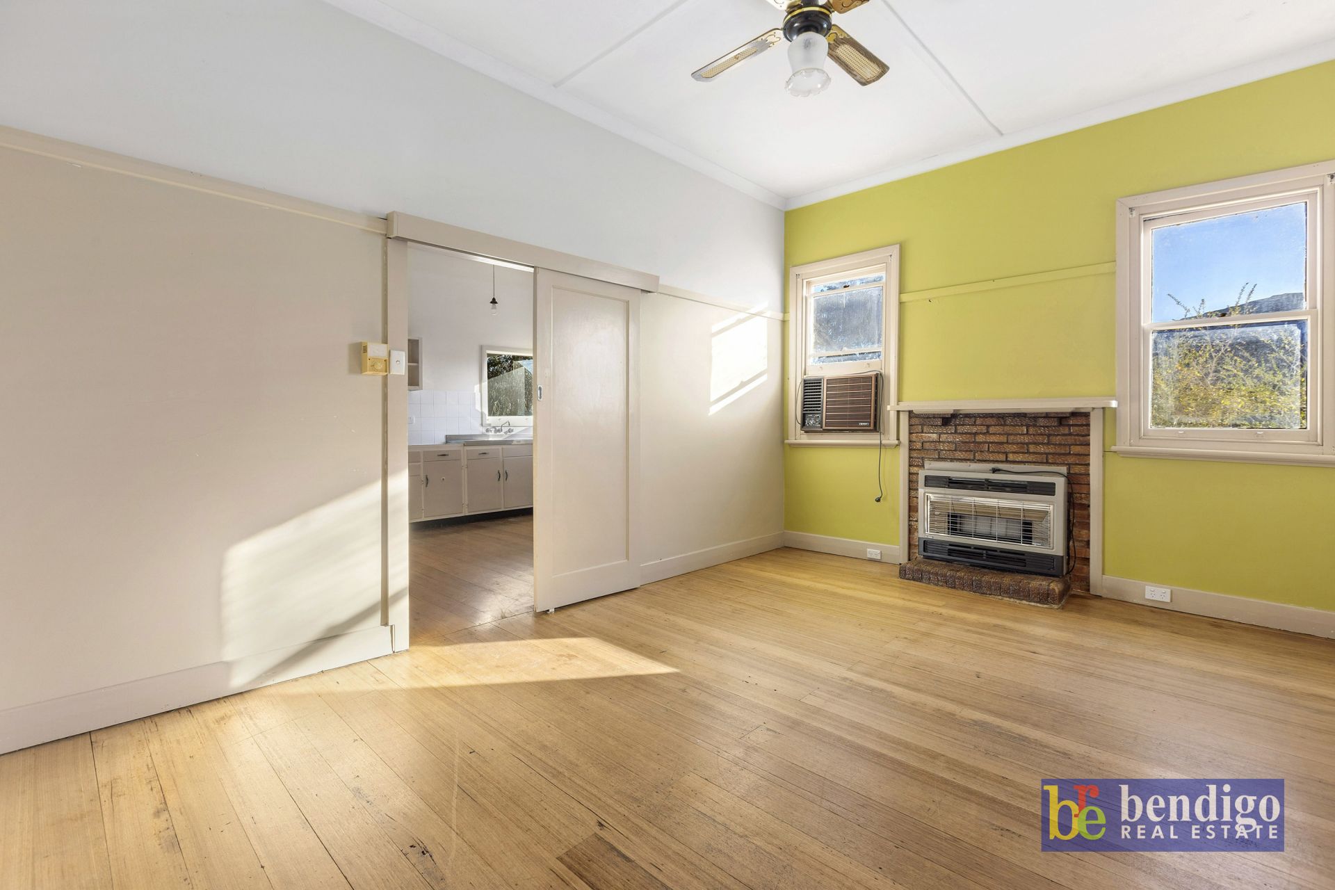 There are three bedrooms here. At 3 x 5metres, the main bedroom is a great size, and features a now closed-in brick fireplace and a deco-style pendant light.