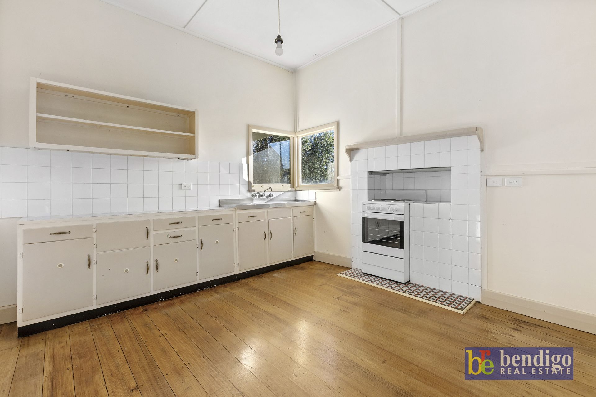 The central loungeroom has a gas heater and a refrigerated air conditioner. The eat-in kitchen retains its original cabinets and cute corner window, which has a leafy view. There’s a modern upright gas stove nestled into the tiled alcove.